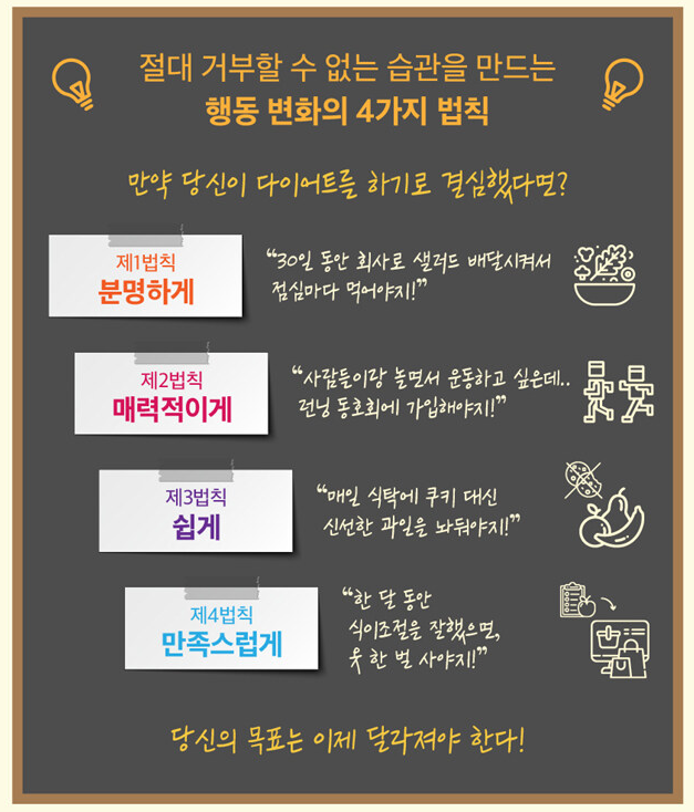 Explanation: This strategy involves starting with very small actions that require minimal willpower, building successful experiences, and naturally leading to habit formation. James Clear, a top self-improvement expert in the United States, emphasizes 'atomic habits' and 'habit stacking' in his book Atomic Habits as key principles for minimizing willpower and maintaining consistency. It is important to make good habits 'easy' and lower the barrier to desired behaviors. If you resolve to 'exercise in the New Year,' according to Clear, this goal is bound to fail. This is because, to form a habit, the resolution must be obvious (Rule 1), attractive (Rule 2), easy (Rule 3), and satisfying (Rule 4).