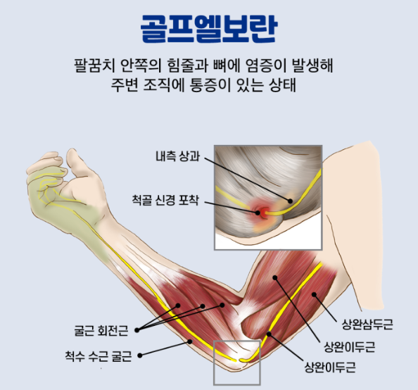 - 어떤 통증? 팔꿈치 안쪽 뼈의 튀어나온 부위와 그 주변에 통증이 나타납니다. 주로 손목을 손바닥 쪽으로 구부리는 근육(손목 굴곡근)의 힘줄이 시작되는 부위에 염증이 생기면서 발생합니다.