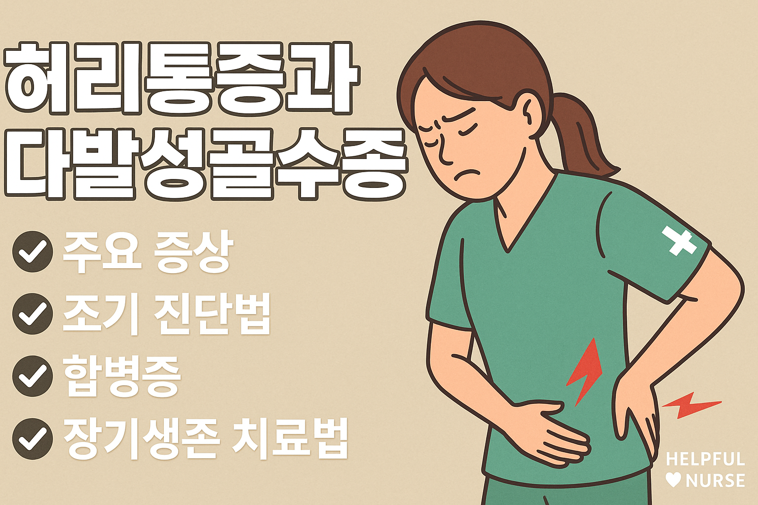🔑 포인트: 단순 허리 통증이라도 일반 치료(물리치료·진통제)로 호전되지 않거나, 설명할 수 없는 빈혈·신기능 이상(갑자기 소변량이나 색깔에 변화가 있을 때) ·피로 같은 전신 증상이 함께 있으면 ‘혈액검사(SPEP, free light chains 등)’ 요청을 고민해 보아야 합니다. 매년 또는 2년에 한 번씩 받는 건강검진에서 혈액 검사(일반혈액검사, 혈액 단백 전기영동 검사, 신장 기능 검사 등), 소변 검사(벤스존 단백 검사) 등을 통해 이상 징후를 발견할 수 있습니다.