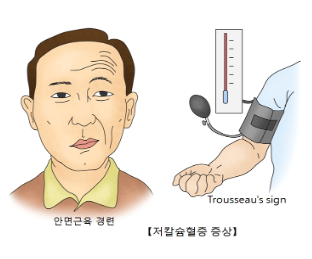 - Chvostek sign, Trousseau sign 관찰 (저칼슘혈증:신경-근육 과흥분성은 입 주위의 안면 신경을 건드리면 안면 근육이 수축하는 츠보스텍 싸인(Chvostek’s sign)과 혈압계를 3분 이상 팽창시킬 때 손발 연축이 일어나 손목과 손 허리 손가락 관절의 구부림, 손가락의 과신전, 엄지손가락을 손바닥 쪽으로 구부리는 등의 특징적인 트루쏘 싸인(Trousseau’s sign)을 유발)