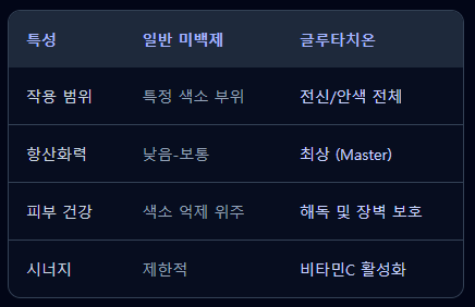 - 주요 기능: 해독 작용, 면역 강화, 멜라닌 경로 차단, 세포 재생