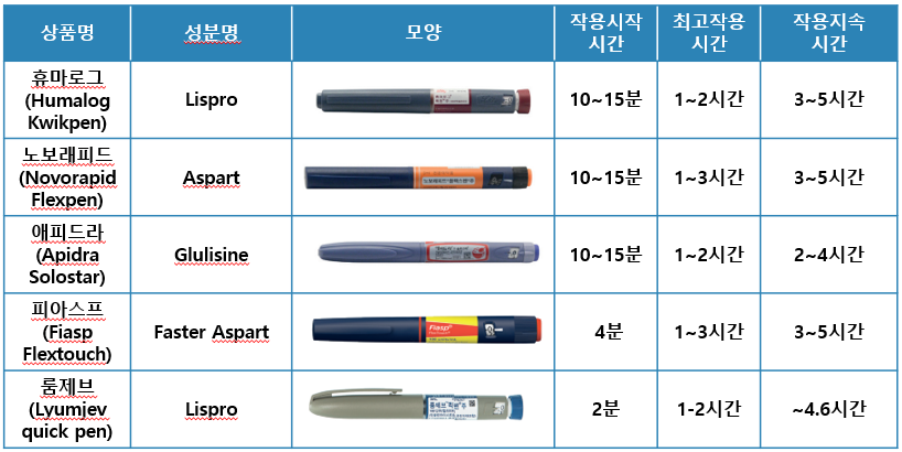 | 식전 인슐린 (속효성, 초속효성) | Aspart(Novorapid), Lispro(Humalog), Glulisine(Apidra) | 투명 | 10~15분 | 1~2시간 | 3~5시간 | 식사 직전 투여, 저혈당 주의 |