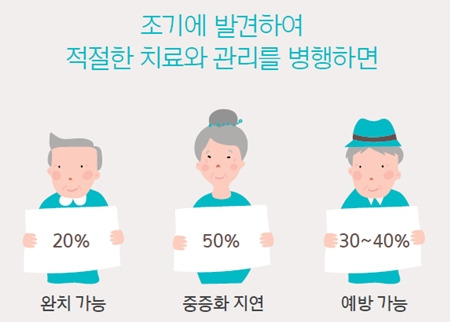 치매 환자 10명 중 1~2명은 조기 발견하여 조기치료했을 때 완치가 가능해요. 치매의 다양한 원인 중 우울증, 갑상선 질환, 뇌종양, 영양 문제 등은 일찍 발견해서 치료하면 치매증상이 회복될 수도 있어요.